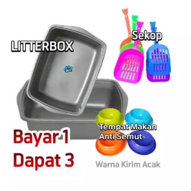 Paket Hemat Bak Litter Box Sedang + Sekop & Tempat Makan anti semut 1 Set Perlengkapan Kucing