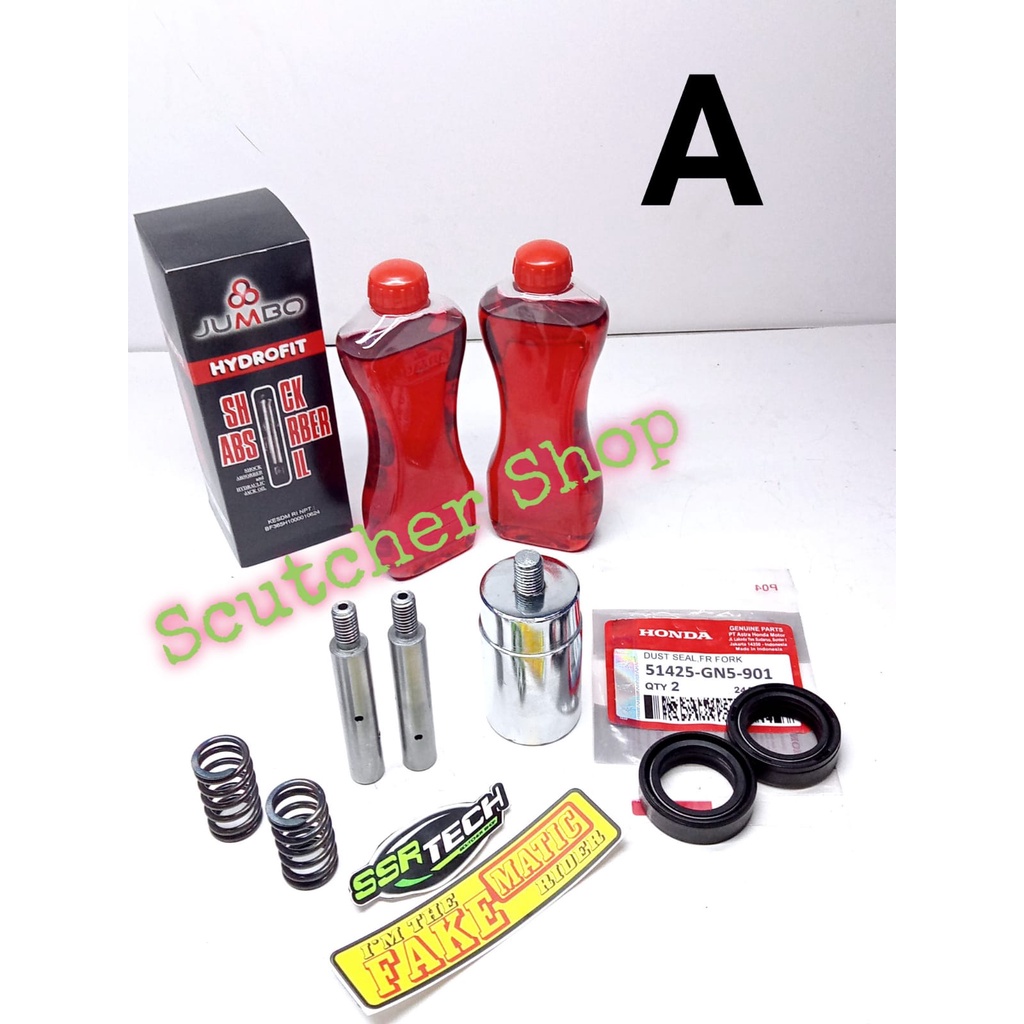 isi paket - peninggi suling depan 1 set ( bahan baja di lengkapi lubang tembus oli atas ke bawah sebagai lubang sirkulasi oli shock agar lebih lancar ) - per suling depan1 set ( lebih tinggi dari bawaan pabrik untuk menurangi efek jedag jedug ) - peninggi shock belakang tabung 1 pcs - Oli shock jumbo - Seal shock 1 set - Free stiker 1 pcs
