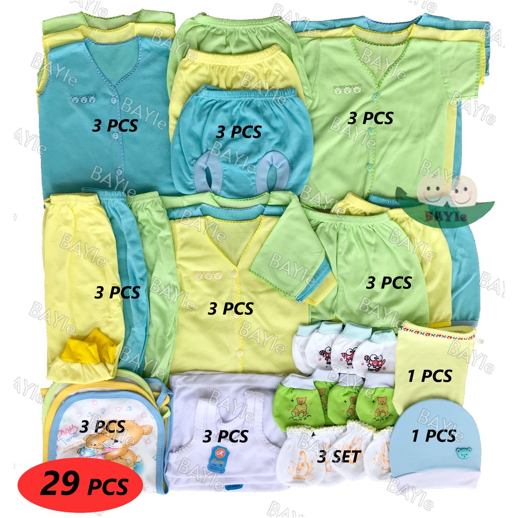 3 Pcs Baju Kutung 3 Pcs Celana Kacamata 3 Pcs Baju Pendek 3 Pcs Celana Pendek 3 Pcs Baju Panjang 3 Pcs Celana Panjang 3 Pcs Popok Kain 3 Pcs Singlet Bayi Size S 3 Set Sarung Tangan Kaki 1 Pcs Waslap 1 Pcs Topi Bulat warna RANDOM sesuai stok Total ada 29 Pcs barang. Sangat murah dan hemat. Warna & Motif RANDOM/ CAMPUR, sesuai ketersediaan stok Selalu ready STOK. Gak perlu tanya barang ready apa gak. Langsung dipesan ya Bun. Terima Kasih