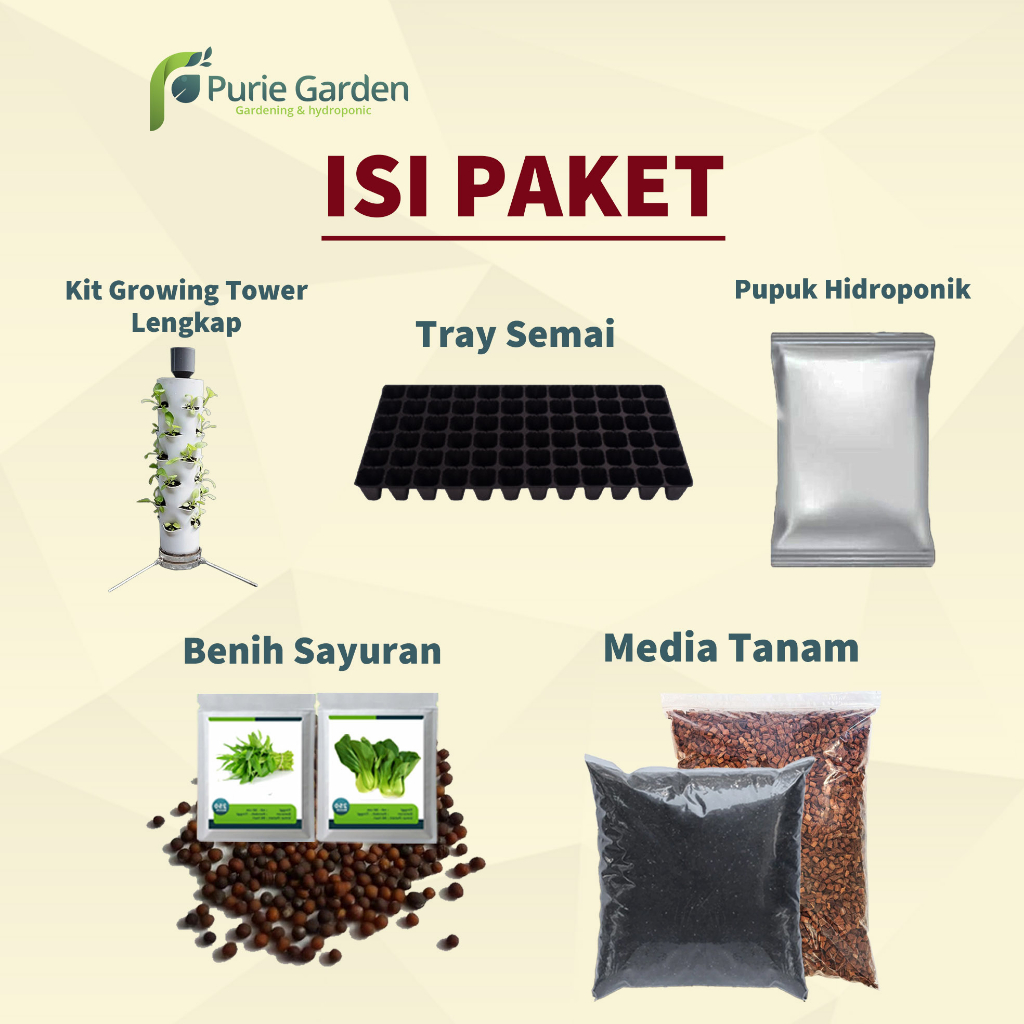 Paket Lengkap : 1. Pipa diameter 5′ berlubang tanam sebanyak 24 lubang 2. Tutup pipa 3. Media tanam coco mini box 4. Media tanam super 5. Kaki besi tower 6. Benih sayuran 2jenis (Bayam & Pak Choi) 7. Nutrisi ABmix Sayuran Daun 250ml Pekat 8. Tray Semai 9. Manifold