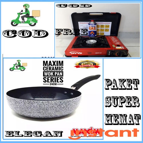 Spesifikasi : ISI DALAM PAKET 1 MAXIM 24 DEEPWOK 2 KOMPOR PORTABLE MYVO 3 GAS KALENG - Diameter : 24cm - Tinggi : 8cm - Bahan : Ceramic Coating - PFOA dan PTFE Free - Merk : Maxim
