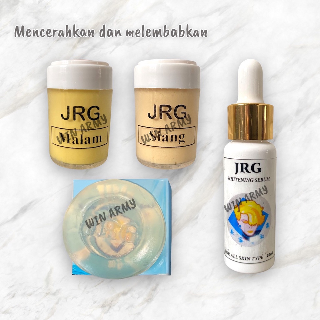 Cream JRG Whitening paket 1 paket terdiri dari: @ cream siang @ cream malam @ sabun pencuci muka @ serum JRG Manfaatnya : - memutihkan wajah secara alami dan aman - memudarkan flek hitam bekas jerawat - mengecilkan pori-pori wajah - meratakan tekstur warna kulit - mengatasi masalah wajah kusam/kering - membuat wajah tampak lebih bersih,cerah dan glowing Untuk semua jenis kulit NB: cream encer saat sampai kepada konsumen itu karena dari pihak ekspedisi yang terlalu lama mendiamkan paket dibawah sinar terik matahari/mesin kendaraan yg panas. krn cream ini tidak cocok utk didekatkan dgn suhu panas (MELELEH/CAIR) hal yg perlu diperhatikan saat tekstur menjadi cair adalah segera memasukan kedalam kulkas tempat telur yaaaa :) diamkan selama 1 malam.
