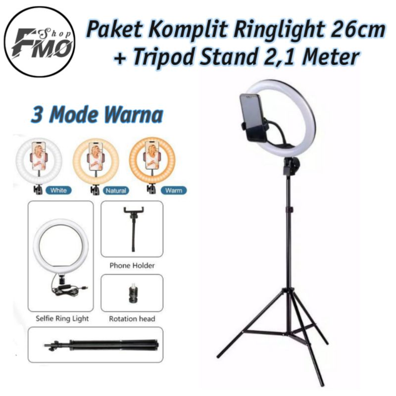 Paket Komplit Ringlight Ring Light 26cm 26 Cm + Tripod 2,1 Meter 2 Meter Lampu Selfie live Make Up Vlog Vlogger MUA