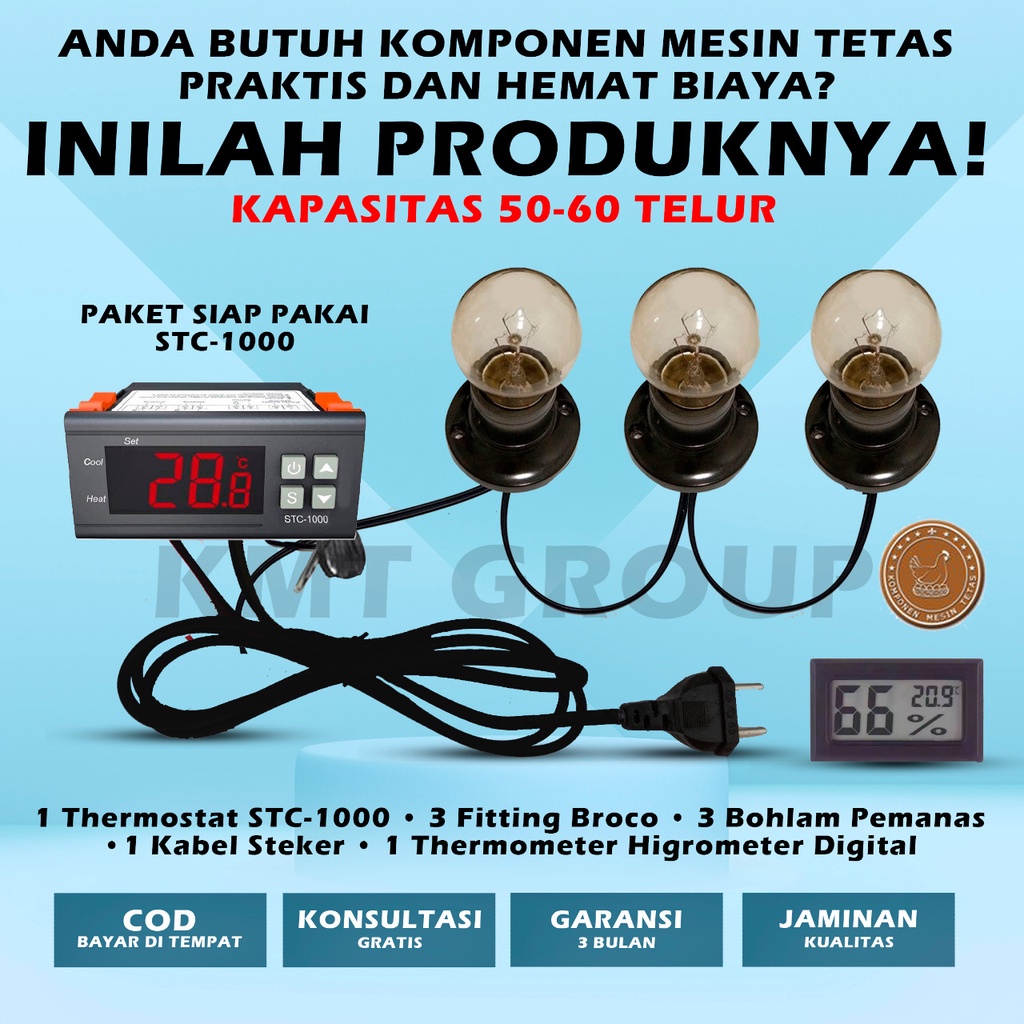 Komposisi terdiri dari : - Paket Siap Pakai Thermostat STC 1000 dengan - 3 Fitting - 1 Thermometer Higrometer Digital - Motor Rak Geser - Timer DH48S-S ( dipasangkan langsung ke kabel motornya )