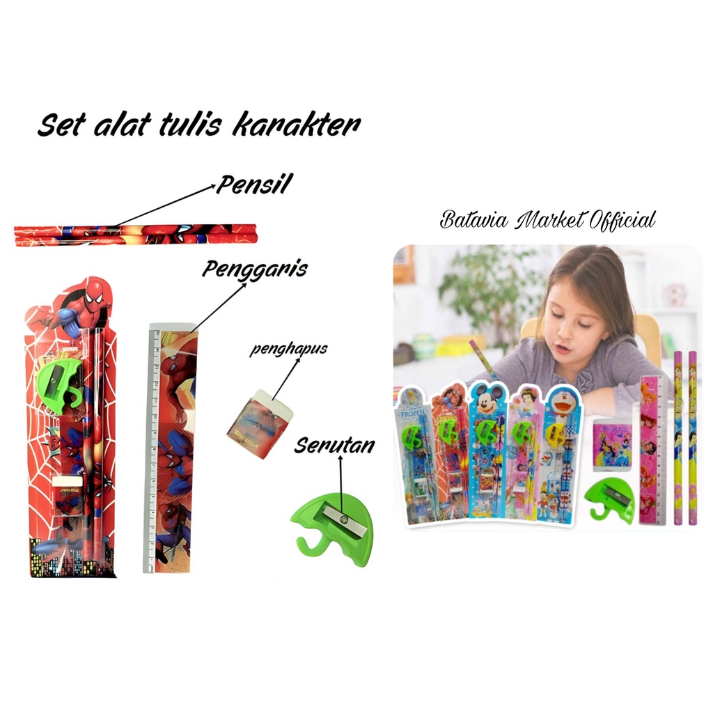 Paket peralatan menulis untuk anak dengan desain bergambar terdiri dari pensil,penghapus,penggaris dan rautan. Cocok digunakan untuk keperluan belajar/ATK biasa, aksesoris, hadiah ataupun souvenir.