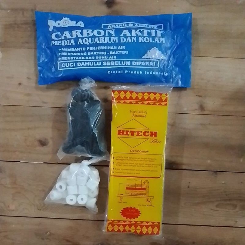 Paket terdiri dari 1 pc kapas filter merk Hitech 1 pc Carbon Aktif 40 pcs Bio Ring Keramik 40 pcs Bio Ball Golf