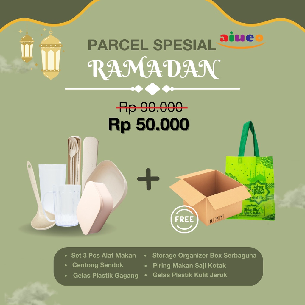 Paket berisi : 1 Storage Organizer Box 1 Gelas Plastik Kulit Jeruk 1 Gelas Plastik Bening 1 Piring Makan Saji Kotak Persegi Wheat Straw Jerami 3 Pcs Alat Makan Sendok Garpu Sumpit Wheatstraw 1 Centong Kuah Sayur 1 Tote Bag Spesial Ramadon 1 Kartu Ucapan 1 Dus pengiriman