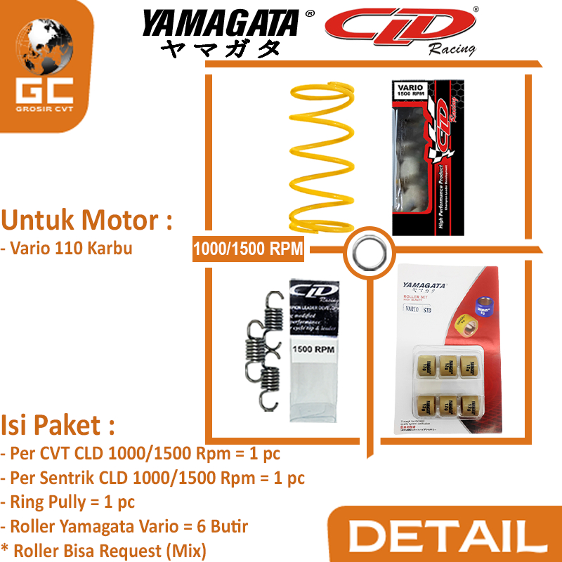 1 paket berisi : ✅ Per CVT CLD 1000/1500 RPM = 1 pc ✅ Per sentrik CLD 1000/1500 RPM = 1 pc ✅ Roller Yamagata = 6 butir ( bisa reguest ukuran maupun MIX) ✅ Ring Puli = 1 pc Keterangan : Per putih = 1000 rpm , per kuning = 1500 rpm