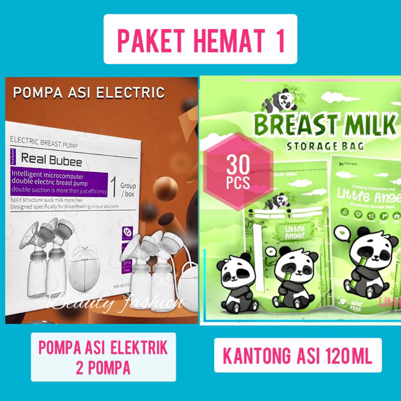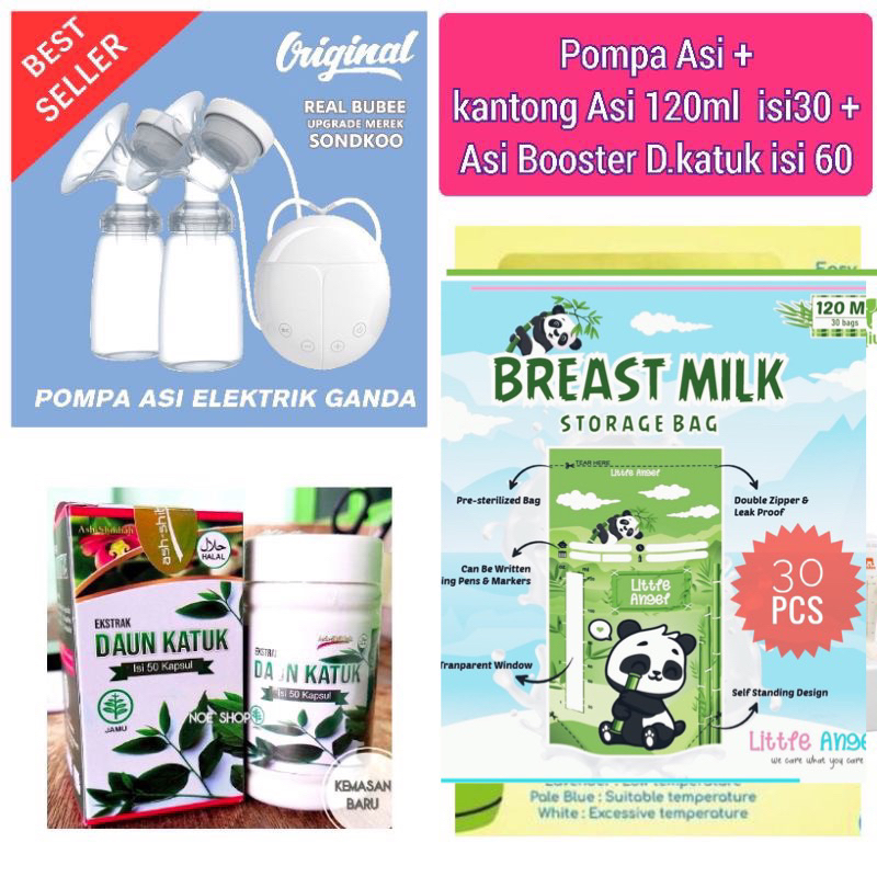 paket berisi Pompa Asi Real Bubble double pump. dgn 2 botol Kantong Asi 120ml Asi Booster Daun Katuk atau Daun kelor sesuai pilihan