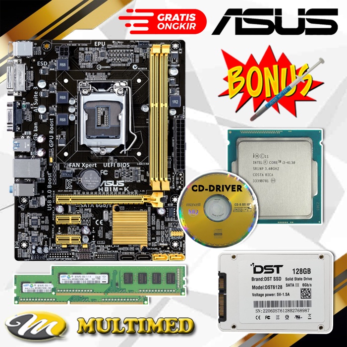 -Mainboard Soket 1150 H81 DDR3 (Pilih di Variasi) -Processor Core I3 4130 / Haswell / Generasi 4 -FAN -RAM DDR3 (PIlih di Variasi) - SSD DST 128GB -Isi Windows 7 / 10 (Konfirmasi lewat chat atau catatan order)