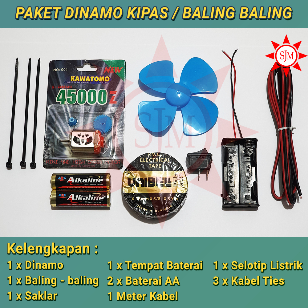 Kelengkapan : - 1 x Dynamo Tamiya - 1 x Saklar - 1 x Tempat Baterai - 1 x Selotip Listrik - 1 x Baling Balign / Kipas (8 cm) - 3 x Kabel Ties - Kabel 1 Meter
