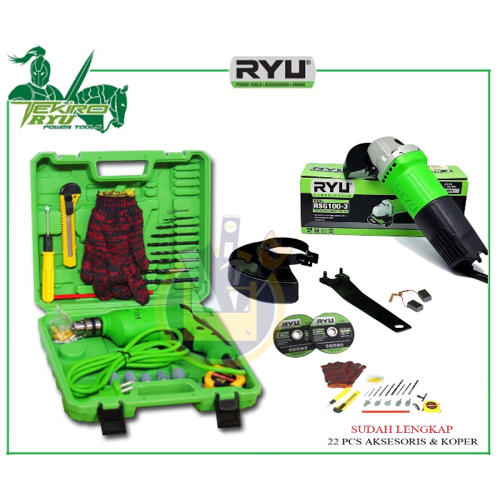 Perlengkapan Rumah > Perkakas > Gergaji, Mesin Pemotong, & Gerinda > PAKET RYU Mesin Bor Tangan Listrik 10 mm Aksesoris Set 22 Pcs Koper RDR 10-3 REB + Mesin Gerinda Tangan 4 inch RSG 100-3 MURAH ORIGINAL BERGARANSI