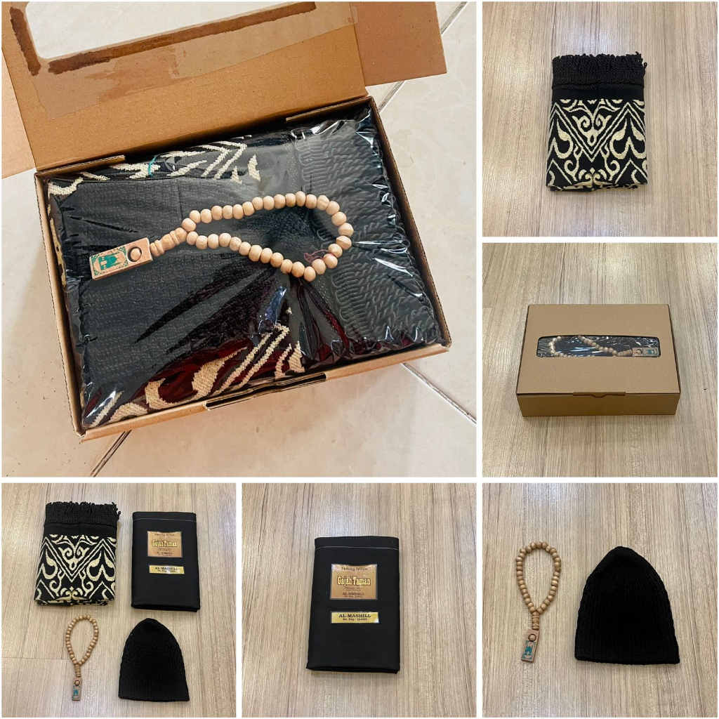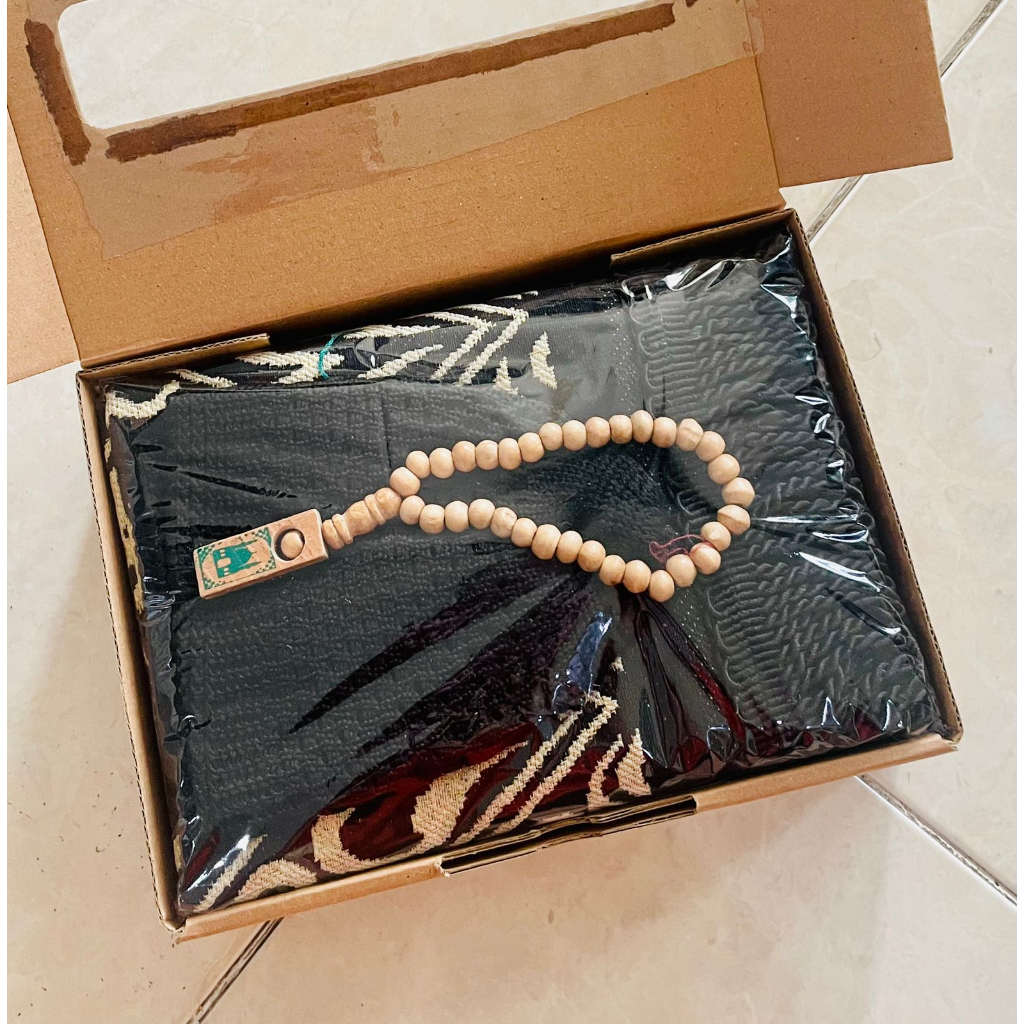 1 box berisi: 1 sajadah Shenille Kiswah Tambang ketebalan sedang, ukuran 60 x 110 1 sarung tenun Gajah dewasa 1 tasbih 1 Peci Rajut Sudah Termasuk kartu ucapan boleh pilih sesuai foto free buble wrap free kertas kado batik sinar dunia