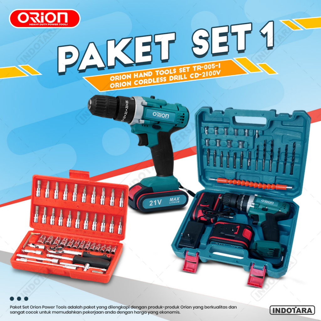 Paket Set 1 : 1 Buah Orion Cordless Drill CD-2100V (With BMC Box) + 1 Buah Orion Hand Tools Set TR-005-1