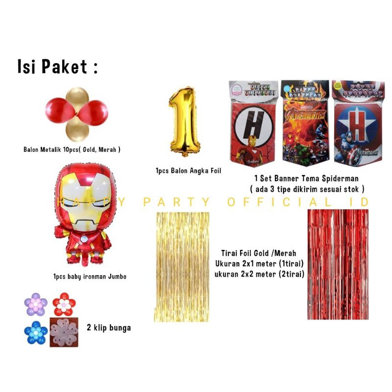 IRONMAN 2 TIRAI 5 buah balon latex gold 5 buah balon latex merah 1 buah balon baby ironman 1 buah banner happy birthday (sudah ada perekat) 1 balon angka (tulis di catatan) 2 buah tirai foil ukuran 1x2 meter warna gold dan merah (sudah ada perekat) BONUS 2 KLIP BALON