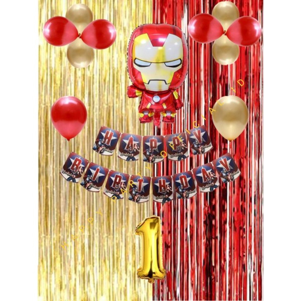 IRONMAN TIRAI MERAH 5 buah balon latex gold 5 buah balon latex merah 1 buah balon baby ironman 1 buah banner happy birthday (sudah ada perekat) 1 balon angka (tulis di catatan) 1 buah tirai foil ukuran 1x2 meter warna merah (sudah ada perekat) BONUS 2 KLIP BALON