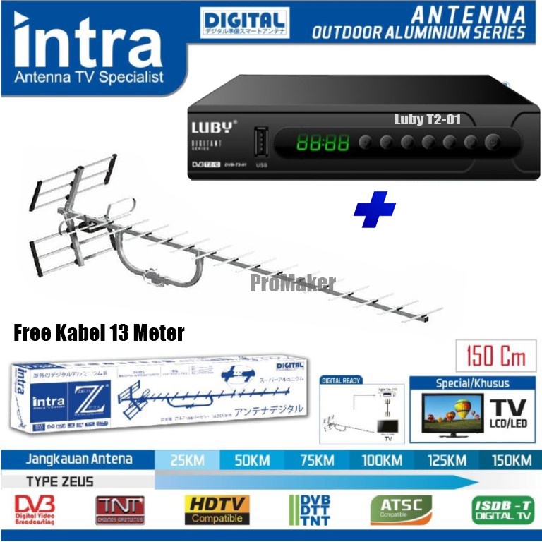 Sudah termasuk Jack TV Jack ke antena sistem drat (mudah dipasang) Antena Digital Outdoor Dari Intra INT-ZEUS (panjang antena 150 cm) Daya tangkap 125 KM dari Stasiun Pemancar TV (tanpa penghalang gedung dan ganguan lain) Bahan Full Alumunium : 100% Sudah termasuk kabel antena : 13 meter