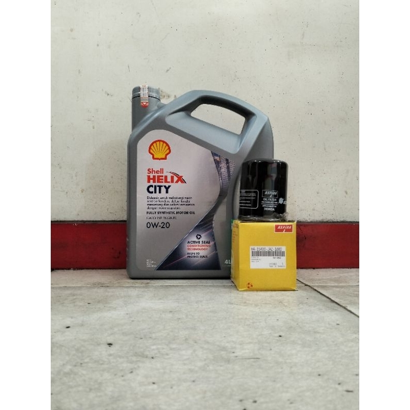 PAKET OLI MESIN SHELL HELIX CITY 0W-20 + FILTER OLI : - 1 BOTOL SHELL HELIX CITY SAE 0W-20 FULLY SYNTHETIC API SP, ILSAC GF 6 Kemasan 4 Liter - 1 BUAH FILTER OLI ASPIRA (H4-15400-JAZ-1800) UNTUK HONDA MOBILIO, JAZZ, BRIO RS, BRV, HRV, ODYSSE, WRV, YRV, CIVIC, CITY