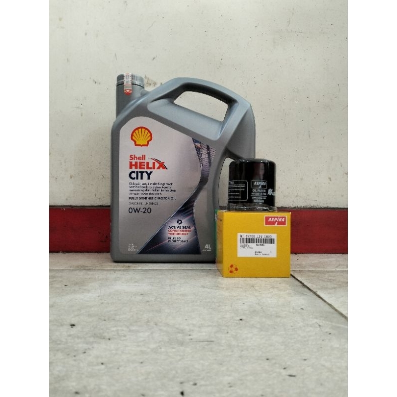 PAKET OLI MESIN SHELL HELIX CITY 0W-20 + FILTER OLI : - 1 BOTOL SHELL HELIX CITY SAE 0W-20 FULLY SYNTHETIC API SP, ILSAC GF 6 Kemasan 4 Liter - 1 BUAH FILTER OLI ASPIRA (NI-15208-LIV-1800) UNTUK NISSAN LIVINA, SERENA, EVALIA, MARCH, LATIO, DATSUN GO PANCA, DATSUN GO+ PANCA, JUKE