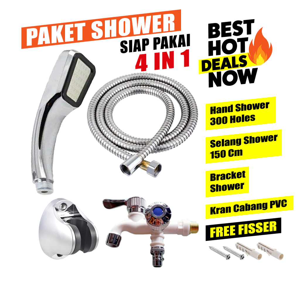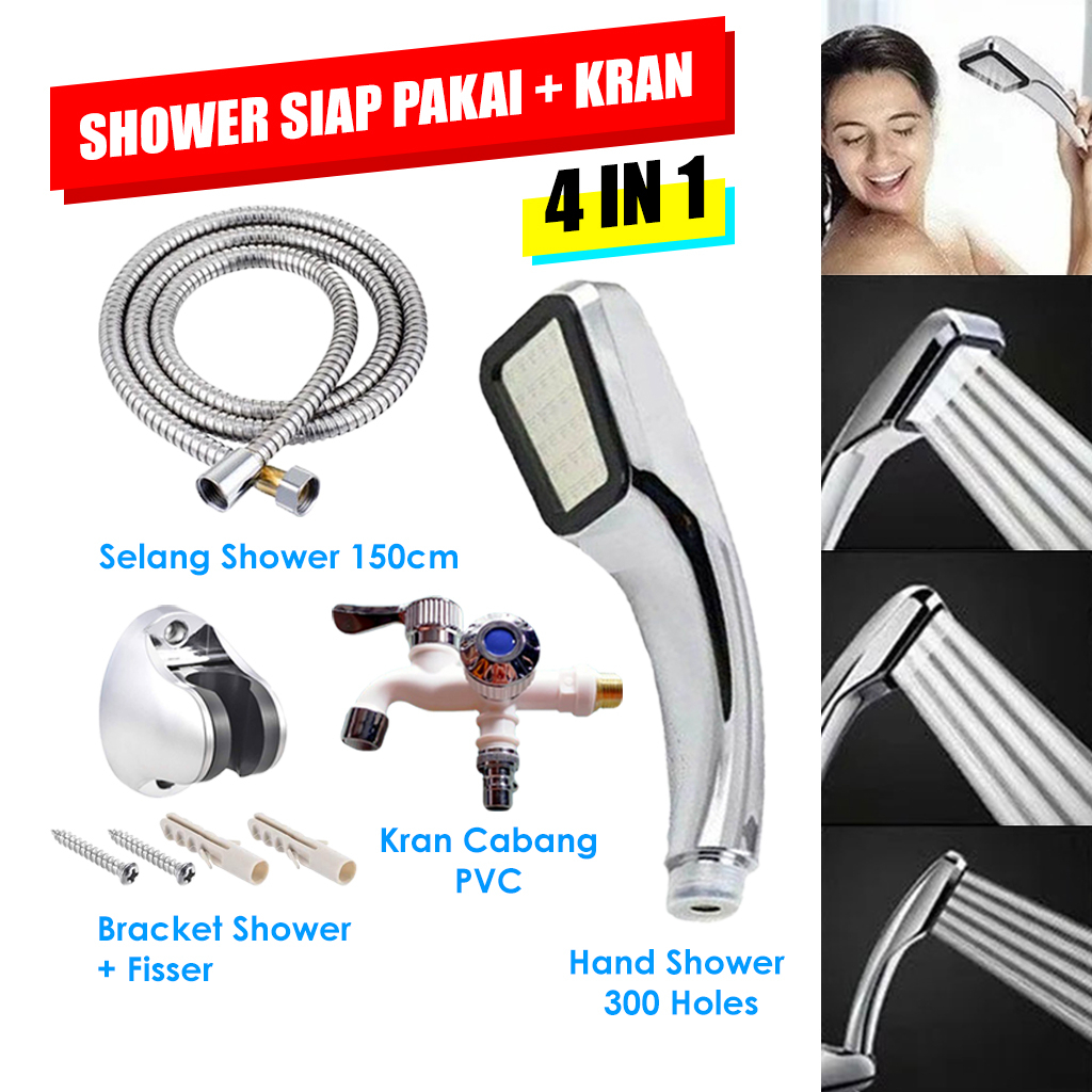 Panjang selang 1.5 meter stand shower bisa diatur naik turun Kran cabang 2 lubang Original Tebal dan Kuat Connector Kuningan Anti Karat dan Anti Bocor ukuran 1/2 in Paket 4IN1Komplit Shower Kepala Mandi Paket 300 Lubang Tekanan Tinggi Pancuran Aerator Head Filter Selang Rumah Salon - Set Paket Shower Mandi - Panjang selang 1.5 meter - Bahan stand shower stainless, bisa diatur naik turun - Kran cabang 2 lubang