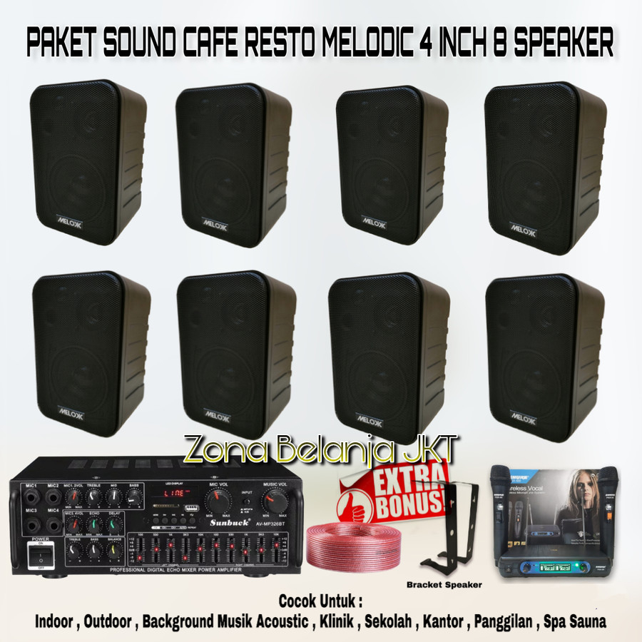 PRODUK YANG ANDA DAPAT : ✓ 8 UNIT SPEAKER PASIF 4 INCH MELODIC ✓ 1 UNIT AMPLI USB BLUETOOTH ✓ 1 SET MIC WIRELESS ( 2 PEGANG ) ✓ 8 UNIT BRACKET SPEAKER
