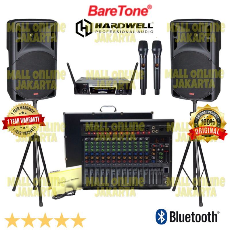 KELENGKAPAN: 1 set Speaker BARETONE 15"inchi MAX15RAE (sepasang /2pcs) 1 pcs Mixer/Equalizer ASHLEY PHONIC 8 (Bluetooth, USB ) 1 Set Stand Speaker 1 Set mic wireless Ashley FREE Kabel Speaker