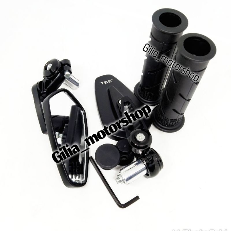 Otomotif > Aksesoris Sepeda Motor > Spion Motor & Aksesoris > (Paket) Spion Jalu Oval Mirror Putih Plus Handgrip Handfat Garis Black Edition Universal Motor