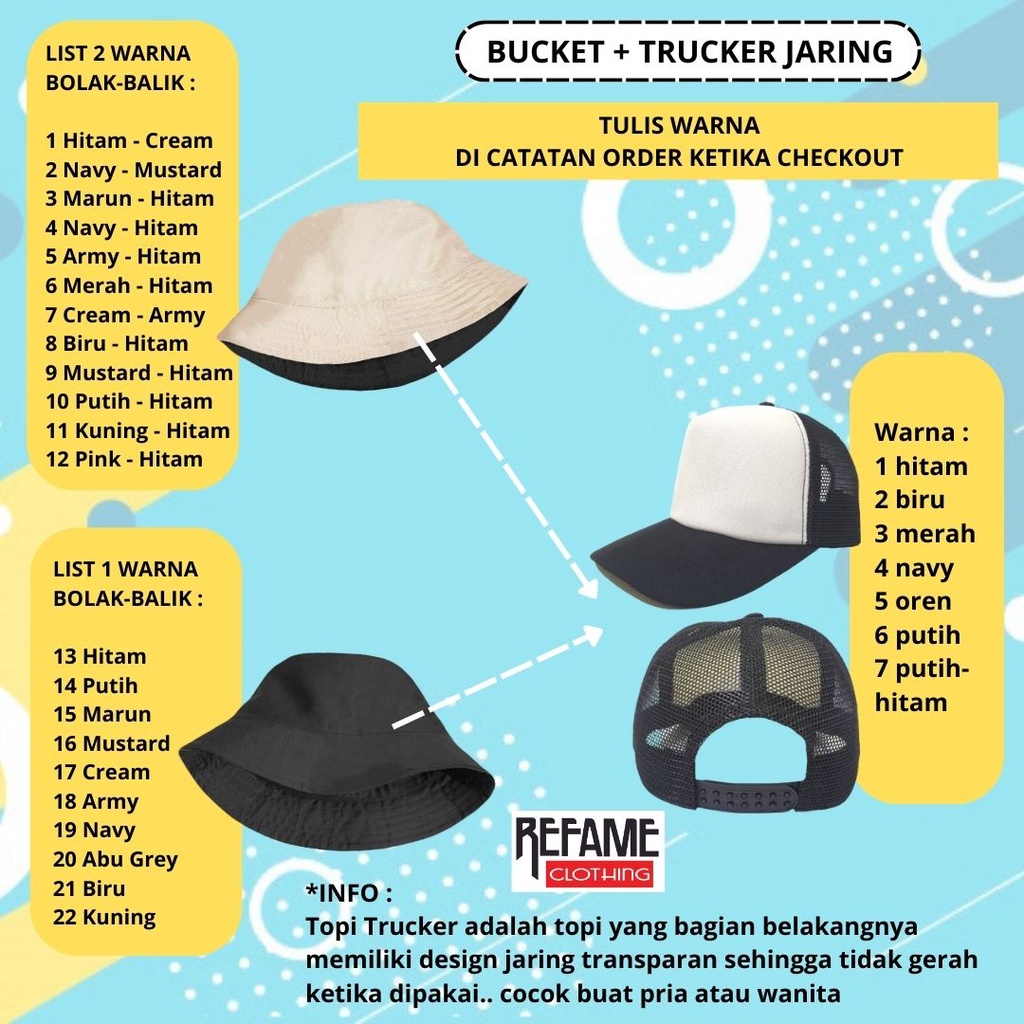 Paket yang bisa dipilih adalah : Topi Bucket Hat + Topi Baseball Topi Bucket Hat + Topi Zumba (Olahraga) Topi Bucket Hat + Topi Trucker (Jaring Korea) Topi Bucket Hat + Topi Komando (Bagian Atas Datar, Belakang Ring Besi)