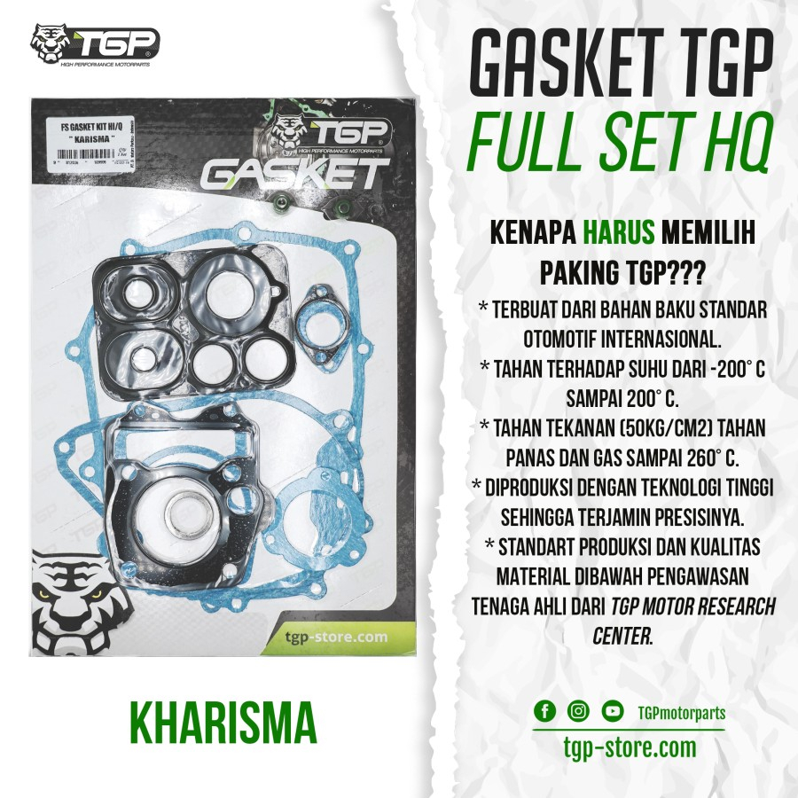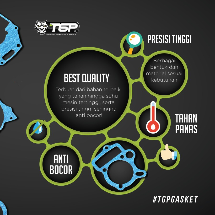 MENGAPA ANDA HARUS MEMILIH GASKET / PAKING TGP : * Terbuat dari bahan baku STANDAR OTOMOTIF INTERNASIONAL * TAHAN terhadap SUHU dari -200° C sampai 200° C * TAHAN TEKANAN (50kg/cm2) Tahan panas dan gas sampai 260° C * Diproduksi dengan TEKNOLOGI TINGGI sehingga TerJAMIN PRESISINYA * Standart PRODUKSI dan Kualitas MATERIAL dibawah PENGAWASAN TENAGA AHLI dari TGP Motor Research Center.