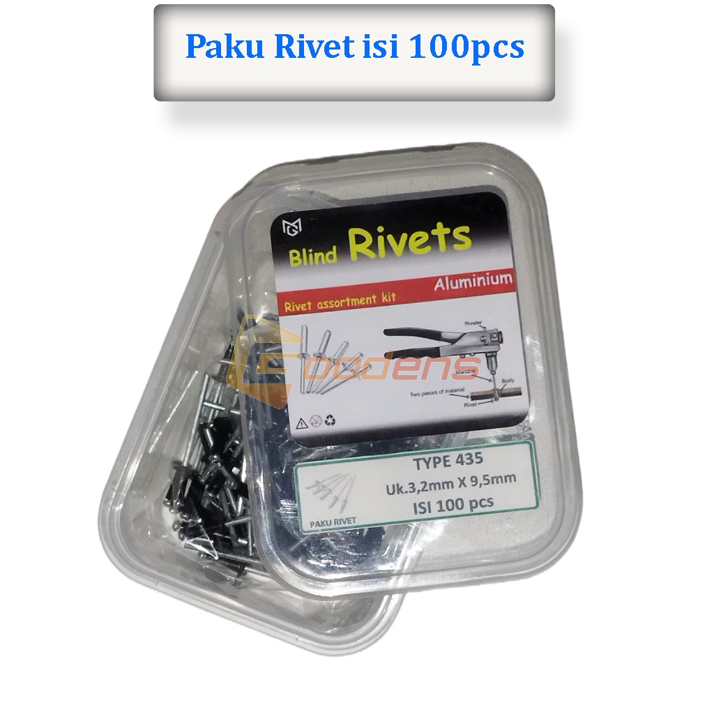 Blind Rivet / Paku rivet / Paku keling umumnya digunakan untuk menyambungkan pelat besi, aluminium atau holo baja ringan. Biasanya digunakan untuk pembuatan hardcase, rak piring, knalpot, dll. Untuk memasang paku rivet diperlukan Tang Rivet (Hand Riverter).