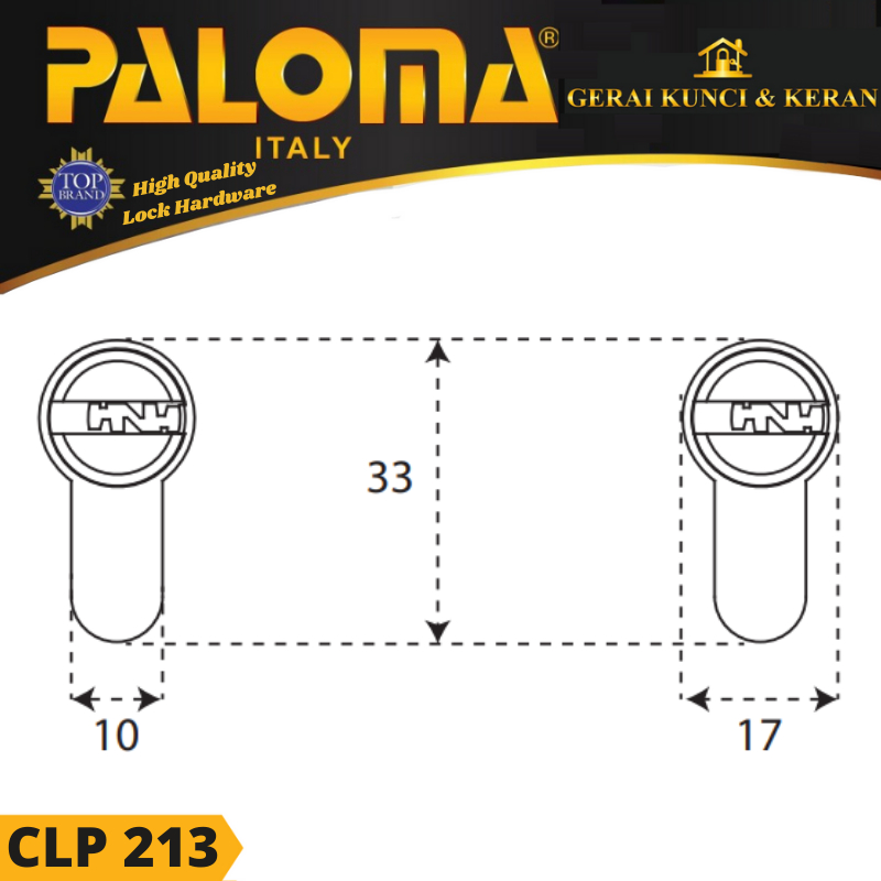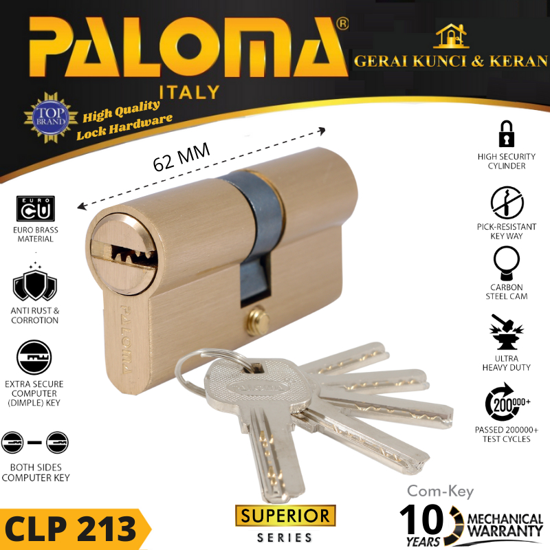 CLP 213 Double Cylinder / Kunci Silinder SUPERIOR Double (Computer Key) PALOMA. - High quality security cylinder. - Maximum security, with pick-resistant pins and hardened materials. - Ultra heavy duty, passed 100000 test cycles. - For high frequency of use such as for public doors in office buildings. - High resistance against rust and corrosion. - Dimple key (computer-key) on both sides. - Master key system available. - 10 Years Mechanical Warranty. - Designed according to European standards. Warna : Satin Brass. Shell & Plug : Hardened brass for durable key-way. Pin : Brass. Hardened. 6 pick-resistant pins for extra security. Key : Brass computer-key, nickel plated. 5 keys included.