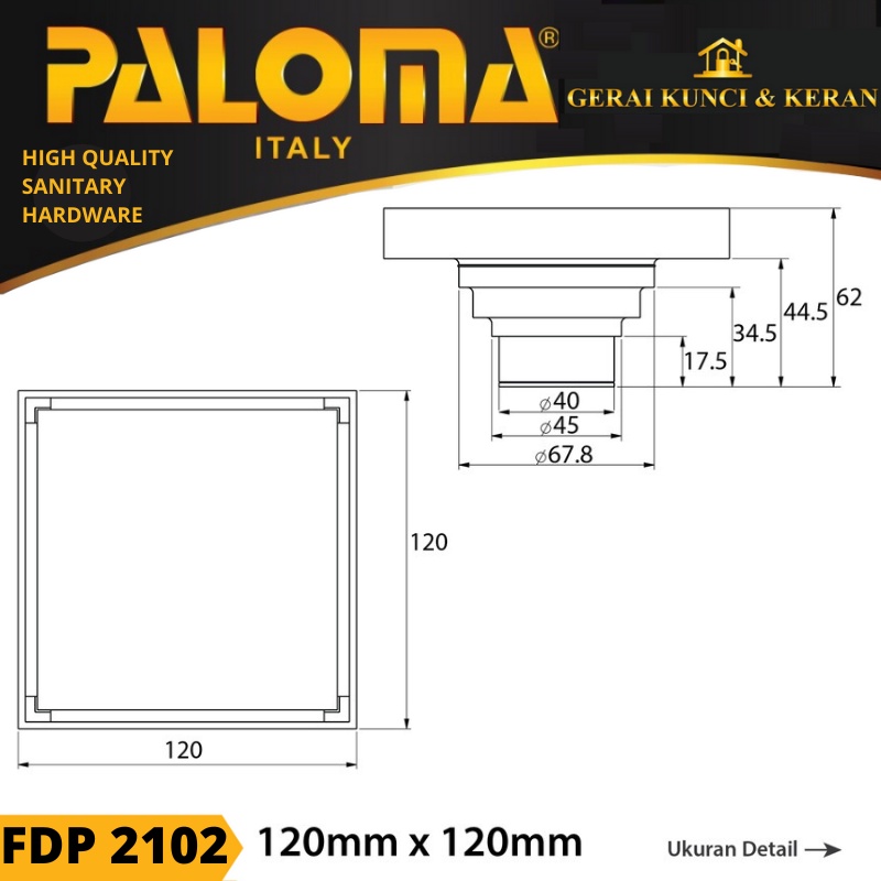 PALOMA FDP 2102 BRASS FLOOR DRAIN (TILE INSERT) 120MM x 120MM - Material 100% brass (kuningan) grade tertinggi dan kualitas terbaik. Anti-karat dan anti-korosi. Padat dan tidak berongga. - Finishing Diamond Chrome Plating (5 lapisan). Teknologi electroplating terbaik. Extra tebal, lebih halus dan jernih sempurna. Sangat awet dan tahan lama. - Heavy duty, katup pembuangan otomatis dengan spring (per) stainless steel SUS 304. - Tile insert, cover plate dapat dibalik dan diisi granite atau keramik. - Anti tikus, kecoa, kelabang, dan hama lainnya. - Anti flood backflow, menghentikan air banjir yang meluap. - Anti bakteri, komposisi copper ion yang tinggi mencegah pertumbuhan bakteri dan kuman. - Anti odour, menghentikan bau yang datang dari pipa pembuangan. - Quick outflow, mengalirkan air buangan lebih cepat. - Diameter pipa pembuangan minimal 50mm (drat 1 1/2 inch) dan maksimal 115mm (drat 4 inch).
