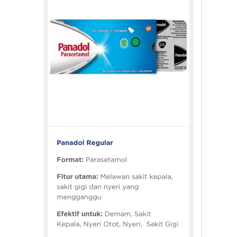 PANADOL merupakan obat dengan kandungan Paracetamol 500 mg. Obat ini dapat digunakan untuk meredakan sakit kepala, sakit gigi, sakit pada otot, nyeri yang mengganggu dan menurunkan demam yang menyertai flu/influensa dan demam. Panadol bekerja pada pusat pengatur suhu di hipotalamus untuk menurunkan suhu tubuh (antipiretik) serta menghambat sintesis prostaglandin sehingga dapat mengurangi nyeri ringan sampai sedang.
