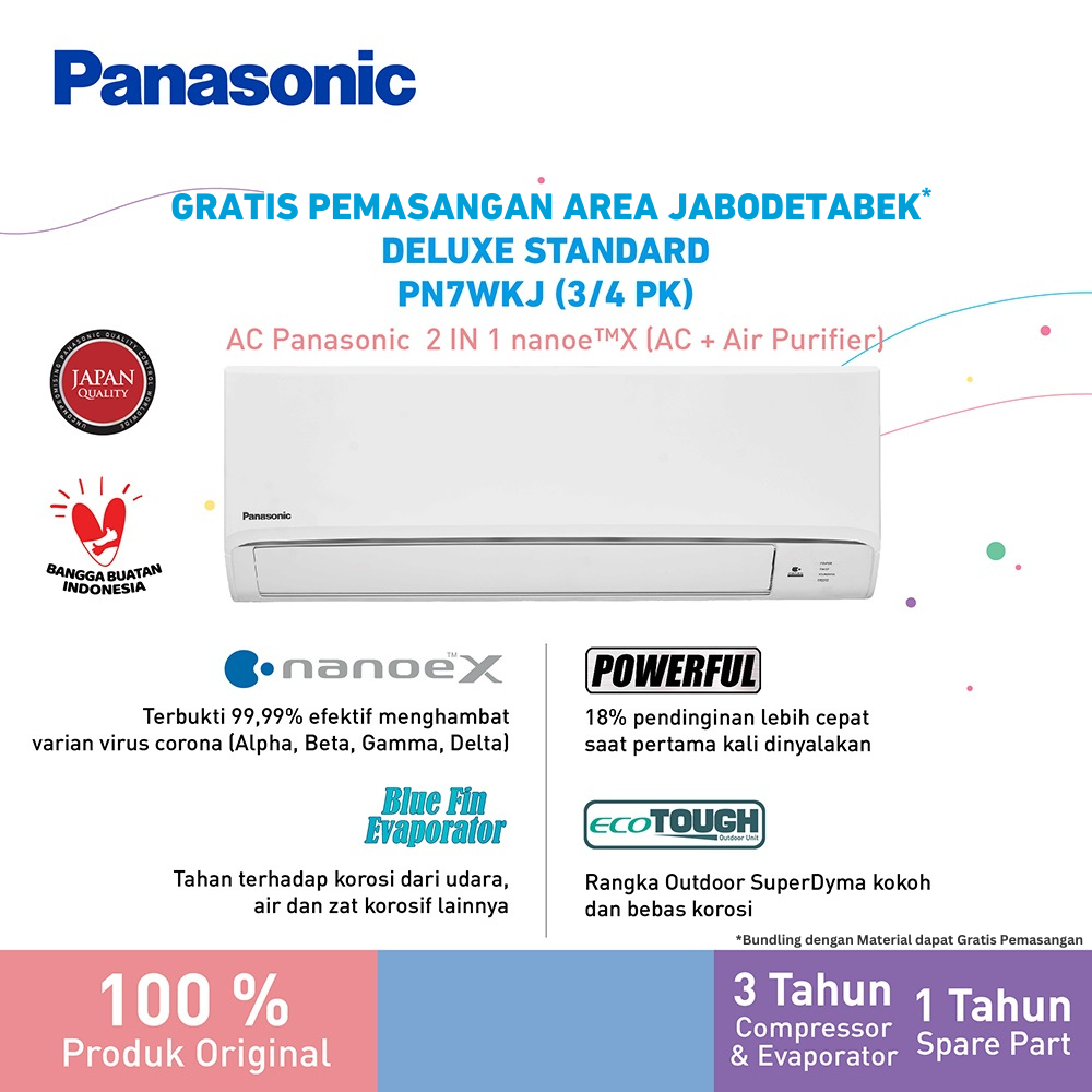 Deluxe Non Inverter - CS/CU-PN7WKJ AC SI-BIRU yang memberikan pendinginan lebih cepat 18% fitur powerful dan dilengkapi dengan pemurni udara teknologi nanoe G dan nanoe™ X sehingga udara lebih sehat dan segar, tentunya hemat listrik karena pemurnian udara ini bisa ON selama 24 jam hanya 25watt/jam walaupun AC dalam kondisi OFF. Nanoe™ Teknologi Siistem Pemurnian Udara Teknologi Nanoe™ yang revolusioner berfungsi untuk menghilangkan bau tak sedap, menonaktifkan bakteri dan virus, jamur, serbuk sari, alergen hingga 99%, menghilangkan debu di udara hingga sekecil PM2.5 sehingga ruangan Anda segar dan bersih serta dapat melembabkan kulit dan rambut. Blue Fin Evaporator Sirip penyerap panas pada Evaporator dengan material "Blue Fin" yang tahan terhadap korosi dari udara, air dan zat korosif lainnya karena bersifat hydrophilic. Selain itu U-Bend pada evaporator dilapisi dengan "Blue Coating" untuk meningkatkan daya tahan evaporator terhadap resiko kebocoran. Teknologi "Blue Fin" bersifat hydrophilic sehingga embun air terpecah ke seluruh permukaan dan mengalir ke bawah menuju bak penampungan air. Nikmati Pendinginan yang Lebih Cepat Hanya Dengan Menekan Satu Tombol Mode POWERFUL akan menjalankan kompresor dan kipas dalam ruangan dengan kecepatan super tinggi sehingga secara otomatis menjaga kesejukan dan menciptakan kenyamanan dalam ruangan. 18% PENDINGINAN LEBIH CEPAT Garansi Evaporator 3 Tahun SPESIFIKASI Model: - Unit Indoor: CS - PN7WKJ - Unit Outdoor: CU - PN7WKJ Kapasitas Pendinginan - kW: 2,64 - Btu/h: 9.000 Konsumsi Daya/W: 760 Tingkat Bintang « «««« EER/Btu/W: 11,28 Dimensi (Indoor/Outdoor) - Tinggi mm: 290 (490) - Lebar: mm: 799 (650) - Tebal: mm: 209 (230) Panjang Pipa: (Max): m: 20 Elevasi Pipa: (Max): m: 15 Panjang Pipa Tanpa Penambahan Refrigeran: (Max): m: 7,5 Ukuran Pipa - Cair: mm: Ø 6.35 - Inch: 1/4 - Gas: mm: Ø 9.52 - Inch: 3/8