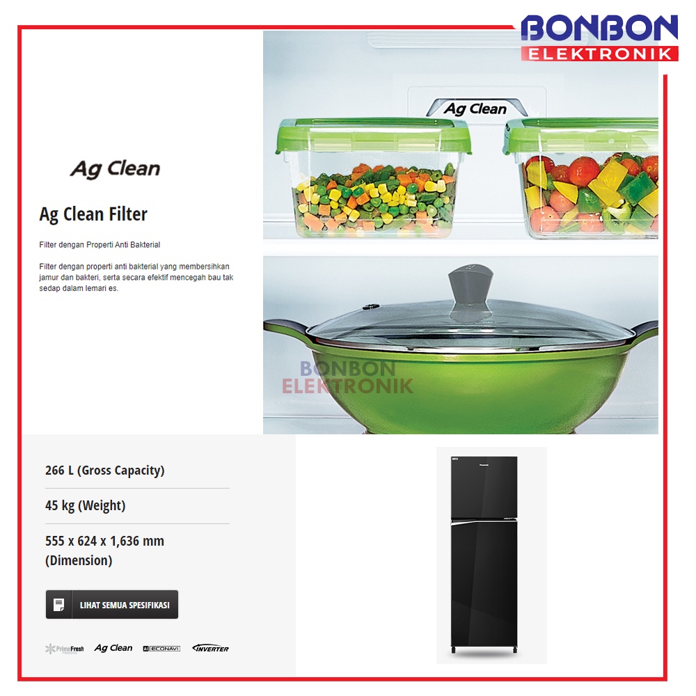 Fitur : Unique Storage Technology Glass Look Door Luxury Elegent Full Frat Door Handle Design Modern Seamless Edge Design Cut Down Consumption Energy Econavi & Inverter Energy Saving Hygienic Ag Clean Deodorizing Filter Prime Fresh 7 Day Freshness With 3 Degree Celcius