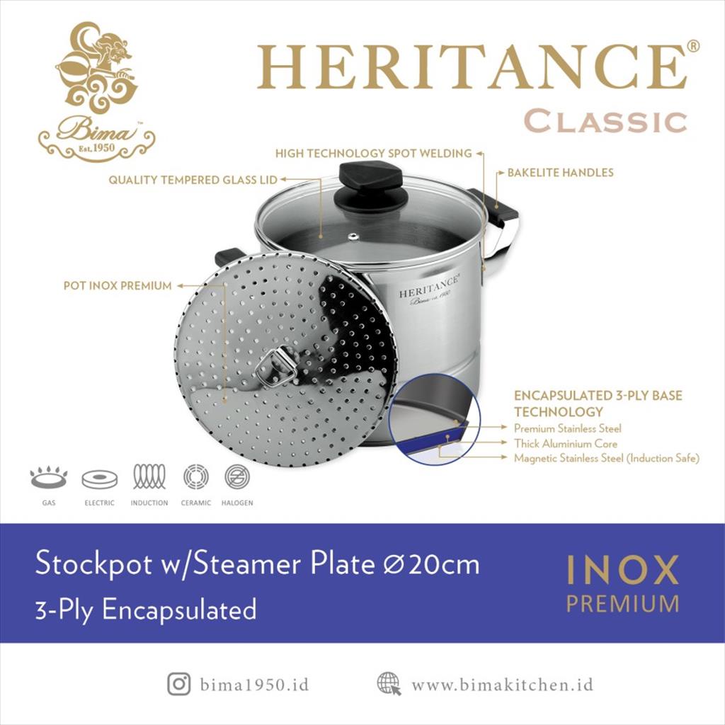 Item : Bima Heritance Classic Stockpot with Steamer Plate 20cm Art No : BP120320 Handle : Durable Bakelite Side Handles Material: Inox Premium Base Panci: 3-Ply / Tri-Ply