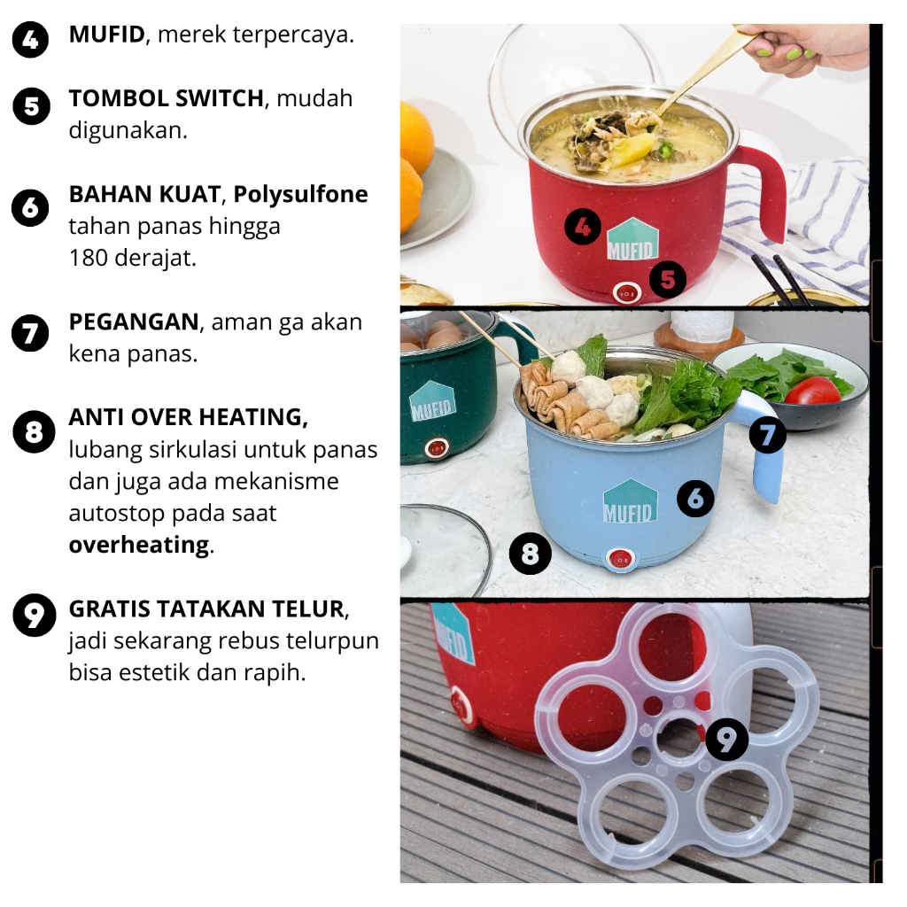 🌿Keunggulan Panci Listrik ➡️ Cepat panas dan merata ➡️ Bahan berkualitas dan mudah dibersihkan ➡️ Warna cantik dan estetik ➡️ Mudah diaplikasikan ➡️ Gagang panci mudah di genggam ➡️ Praktis karena bentuk cukup kecil, hemat tempat dan portable. ➡️ Low Watt atau konsumsi daya listrik rendah.