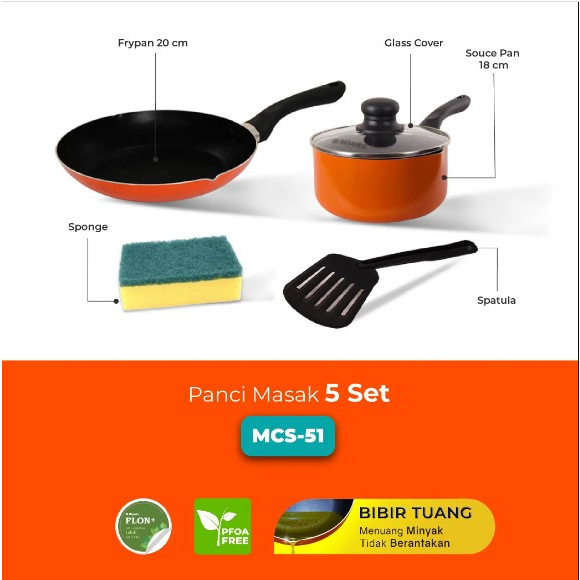 Isi Didalam kemasan : 1.Fry Pan 20cm 2.Sauce Pan 18Cm 3.Glass Cover ( Untuk Sauce Pan 18cm ) 4.Spatula 5.Sponge