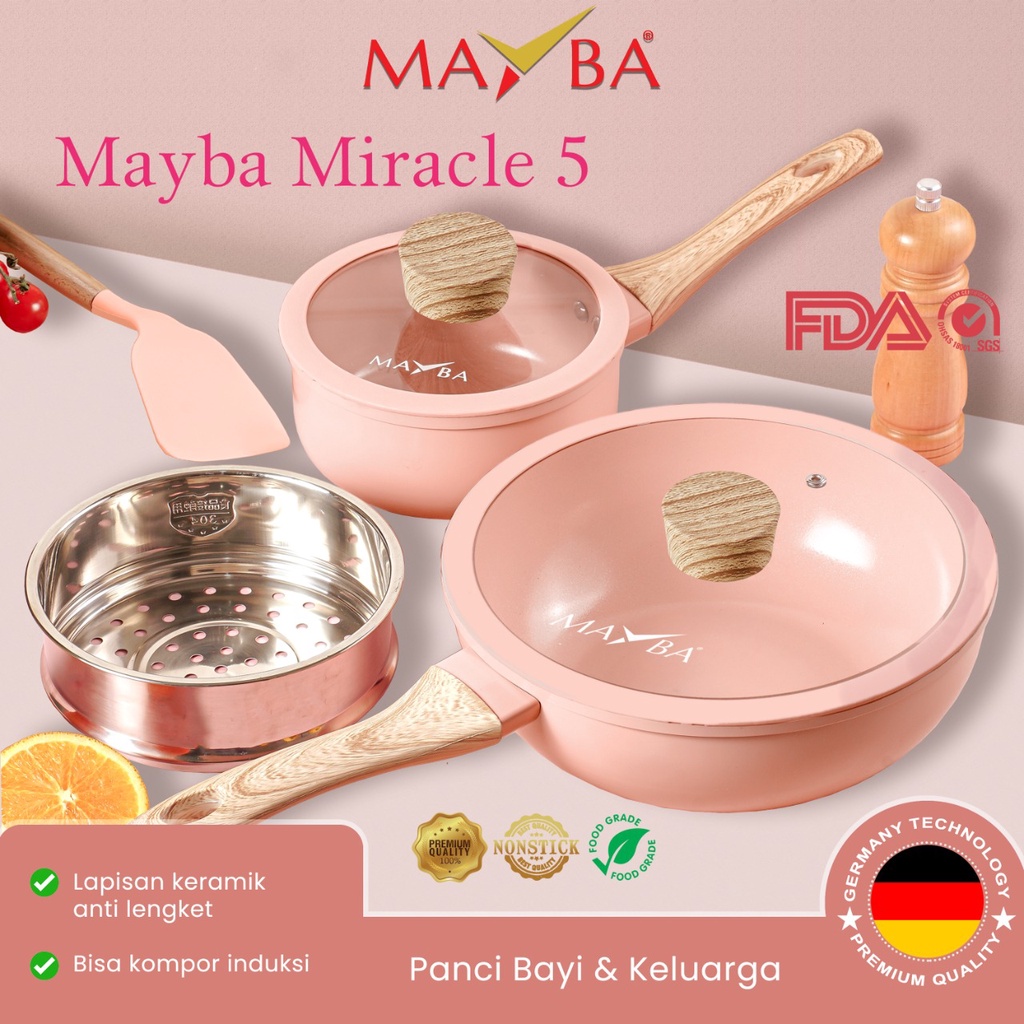FITUR UNGGULAN MAYBA MIRACLE ✅ Bahan coating: Menggunakan lapisan Pearl Ceramic Nonstick untuk kemampuan anti lengket yang optimal dan tahan lama ✅ Technology yang ramah dan Bebas dari zat kimia PTFE, PFOA, Cadmium dan Lead (timbal) sehingga aman bagi anda dan keluarga ✅ Bahan body panci: forged aluminium dengan sistem penyebaran panas yang efisien dan merata ✅ Ketebalan 3MM, dua kali lebih tebal dari panci pada umumnya ✅ Ukurannya yang ideal untuk rumah tangga ✅ desain bentuk dan warna yang unggul ✅ Produk ini termasuk tutup kaca milkpan untuk set 3 Piece & Tutup kaca milkpan. Serta untuk set 5pcs terdapat tutup kaca wok juga dan spatula silicone ✅ Tersedia warna Black Pearl and Pink Pearl Untuk set 3 Piece & Warna White Pearl and Emerald untuk set 5 Piece