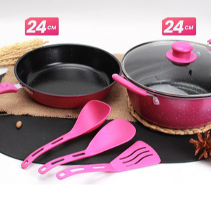 Satu Set terdiri dari: 1.Panci 24cm 2.Tutupan kaca 24cm 3.Panci 24 cm 4.Tutupan kaca 24cm 6.Spatula plastik 3pcs