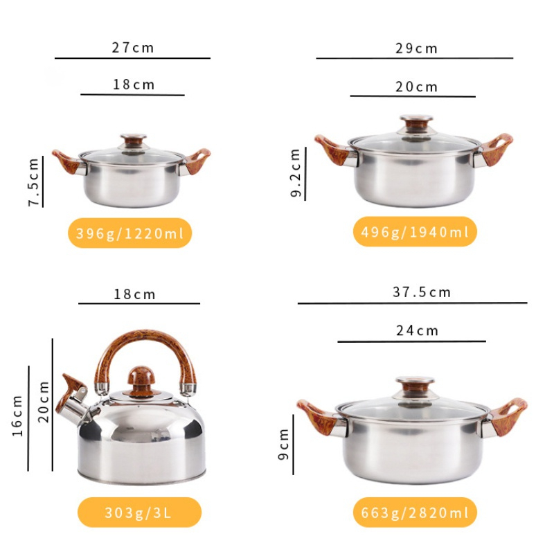 Satu set alat memasak yang terbuat dari stainless steel yang dilengkapi dengan gagang yang terbuat dari kayu. Satu set alat masak yang juga disertai dengan teko air akan sangat membantu anda dalam mengolah bahan makanan dan minuman untuk disajikan bagi keluarga. Sangat cocok digunakan untuk di rumah ataupun di restoran.