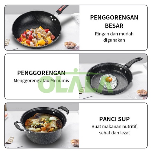 3 pcs perlengkapan dapur, cocok untuk menyiapkan makanan untuk keluarga. Dilengkapi dengan bahan yang tebal, kuat dan anti lengket serta mudah dibersihkan. Dapat digunakan di segala jenis kompor, termasuk kompor induksi.