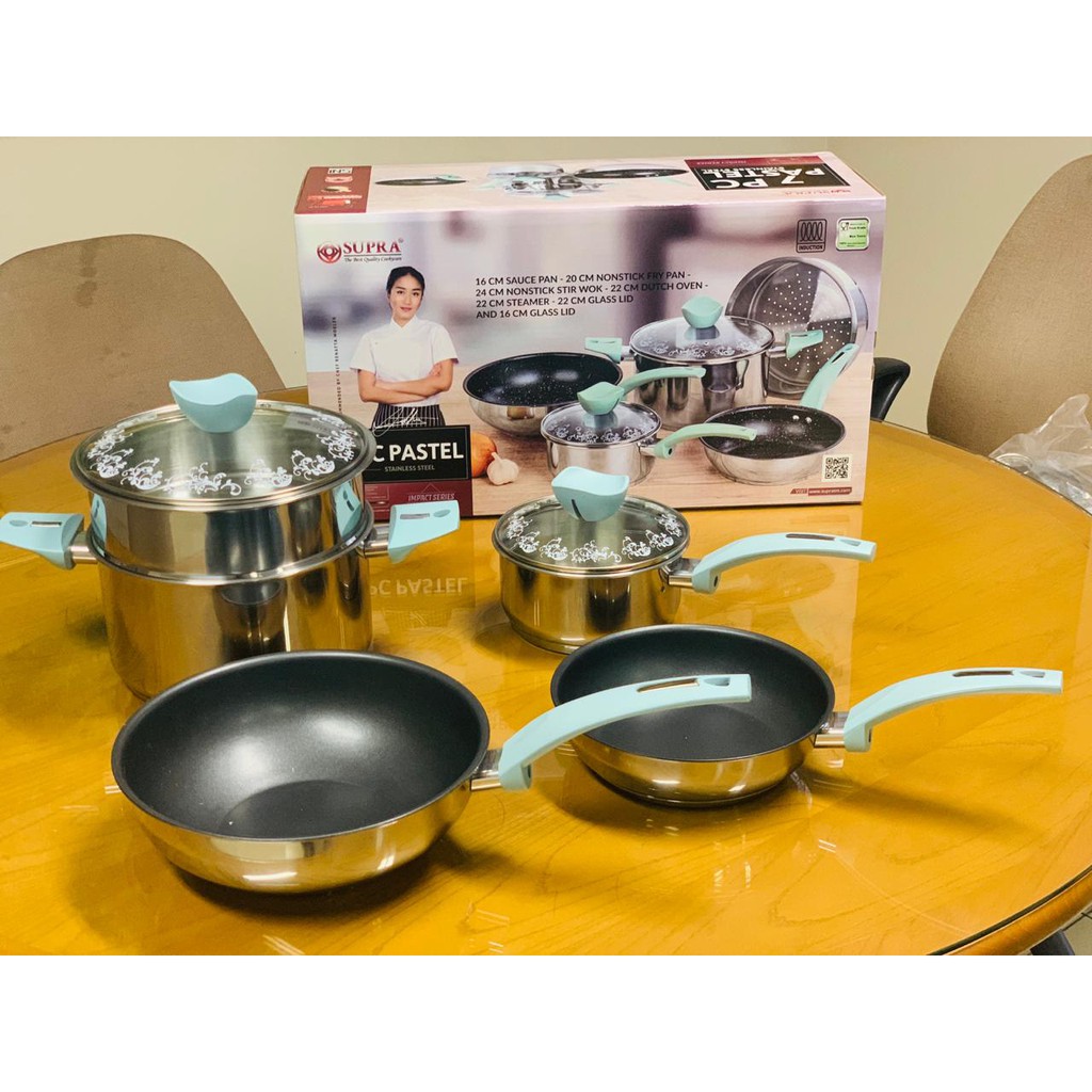 - Panci Supra 7pcs Stainless Steel PASTEL Komposisi : 16cm sauce pan + glass lid 20cm frypan non stick 24cm stirwok non stick 22cm Dutch oven + glass lid 22cm steamer duduk..