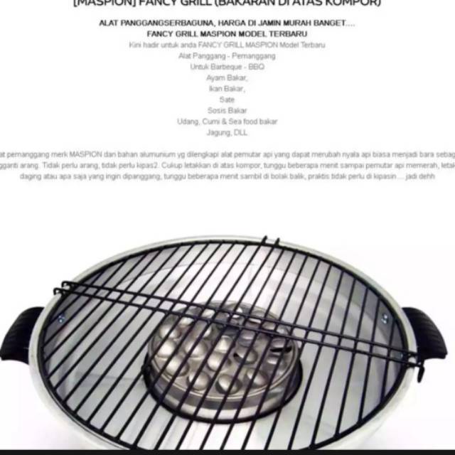 Fancy Grill -Acara berkumpul bersama keluarga, teman, dan kerabat tentunya sangat menyenangkan apalagi memasak bersama, rasanya semakin akrab satu sama lain -Terbuat dari bahan Aluminium berkualitas tinggi dilengkapi dengan alat pemutar api yang dapat merubah nyala api menjadi bara sebagai arang -Mempermudah untuk memasak ikan bakar, barbeque, ayam bakar, sosis bakar, sate, cumi bakar, udang bakar dll -Cara penggunaan : 1. Letakan Fancy Grill di atas kompor 2. Diamkan beberapa saat hingga pemutar api memerah 3. Letakan daging atau bahan makanan yang ingin dipanggang atau bakar 4. Bolak balik daging/bahan makanan selama beberapa menit 5. Hidangan siap disajikan dengan kematangan sempurna sesuai selera