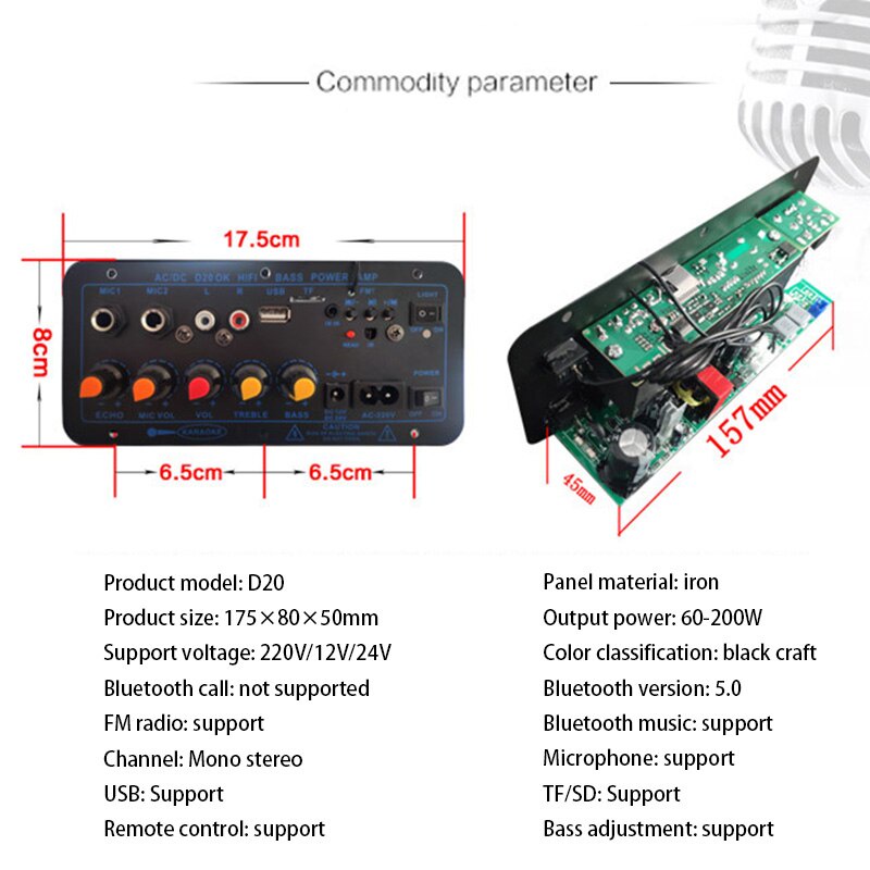 1 x OK Papan Audio Amplifier Bluetooth Sound Booster with Microphone Port - D20 1 x Kabel Konektor 1 x Kabel DC 1 x Kabel Daya 1 x Remot Kontrol Spesifikasi Total Power Output 60-200 W Port I/O USB, Subwoofer, TF Card, RCA Material Panel: Besi Dimensi 175 x 80 x 50 mm Lain-lain Bluetooth: 5.0 Tegangan: AC 220 V, DC 12-24 V