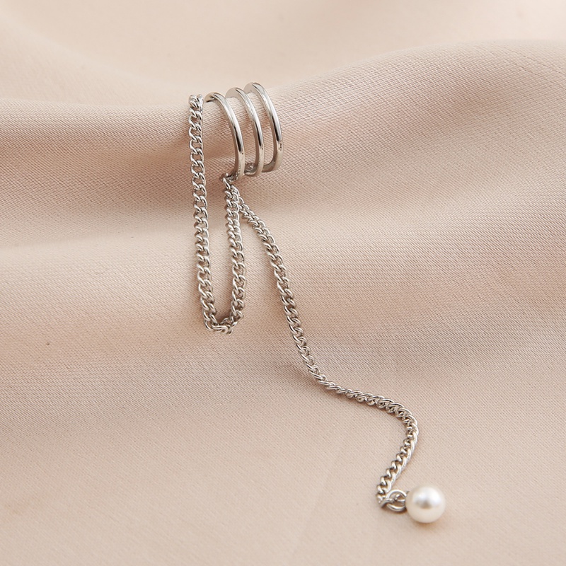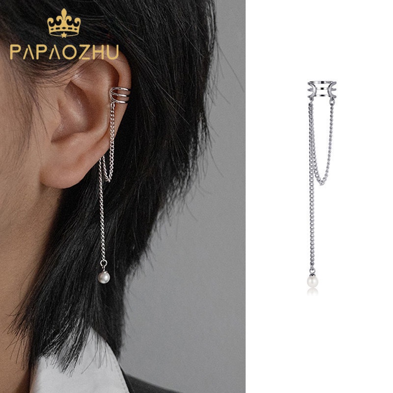 Papaozhu 1PC Korea Tanpa Tindik Mutiara Perak Rumbai Rantai Klip Anting Untuk Wanita Perempuan Sederhana Fashion Tulang Rawan Anting-Anting Telinga Tulang Perhiasan