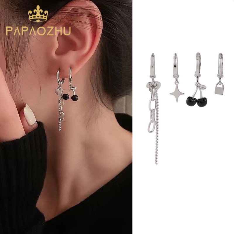 Aksesoris Fashion > Anting > Papaozhu 4 Pcs Manis Keren Hitam Cherry Rumbai Rantai Drop Anting-Anting Set Untuk Wanita Perempuan Korea Bintang Lock Menjuntai Anting-Anting Fashion Telinga Perhiasan Pakaian Sehari-Hari