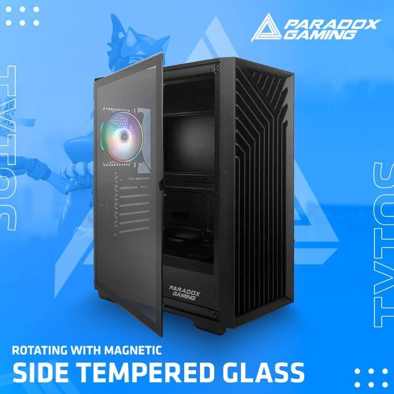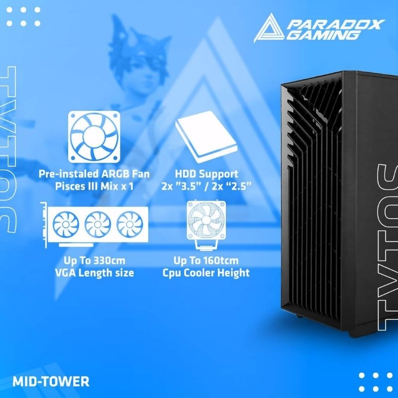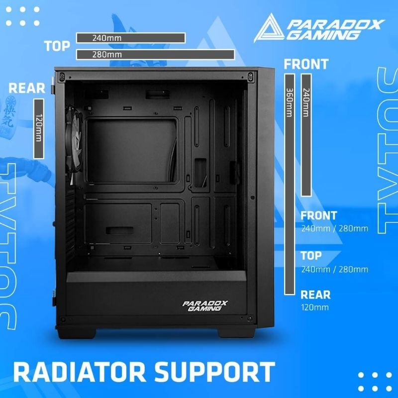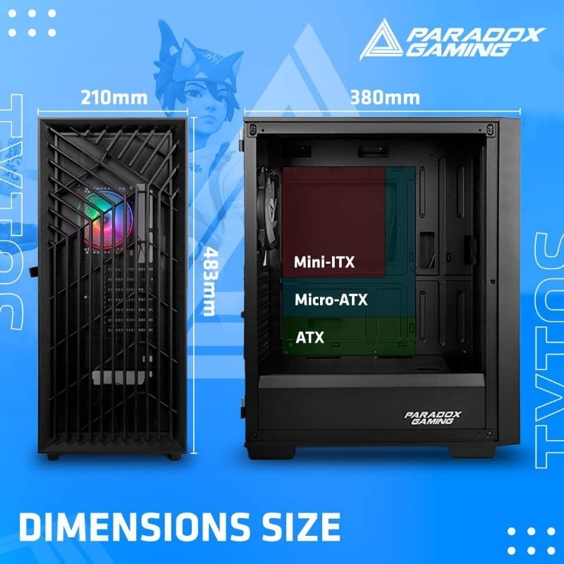 L380 x W210 x H483mmMesh front panel with anti dust, rotating tempered glass side panel ATX, MICRO ATX, MINI ITXUSB3.0*1+USB2.0*1+HD AUDIO7-330mm / 320 if instal fan on front panel 160mm-22-3 x 120mm2 x 120mm / 2 x 140mmPREINSTALED 1 x 120mm paradox gaming piscess ARGB FAN