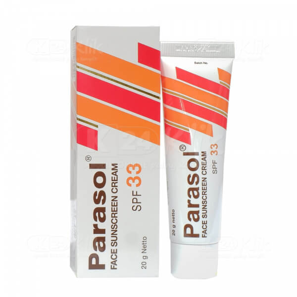 PARASOL FACE SUNBLOCK SPF 33 CREAM merupakan produk perawatan kulit berupa krim pelindung sinar matahari yang mengandung ekstrak lidah buaya, vit.E, dan Sunblock SPF33. Krim ini digunakan untuk melindungi kulit dari pengaruh buruk sinar matahari matahari sekaligus menjaga kelembapan kulit. Krim ini juga dapat digunakan sebagai alas bedak. Indikasi Umum Produk ini digunakan sebagai krim perawatan kulit yang memberikan perlindungan pada wajah terhadap sinar matahari. Komposisi Octyl methoxycinnamate, Oxybenzone, Microtitanium dioxide, Tocopherol acetate, Aloe vera Dosis Oleskan 30 menit sebelum terkena sinar matahari Aturan Pakai Hanya pemakaian luar. Oleskan produk suncreen pada kulit sebelum terpapar sinar UV. Gunakan kembali secara berulang untuk menjaga perlindungan.