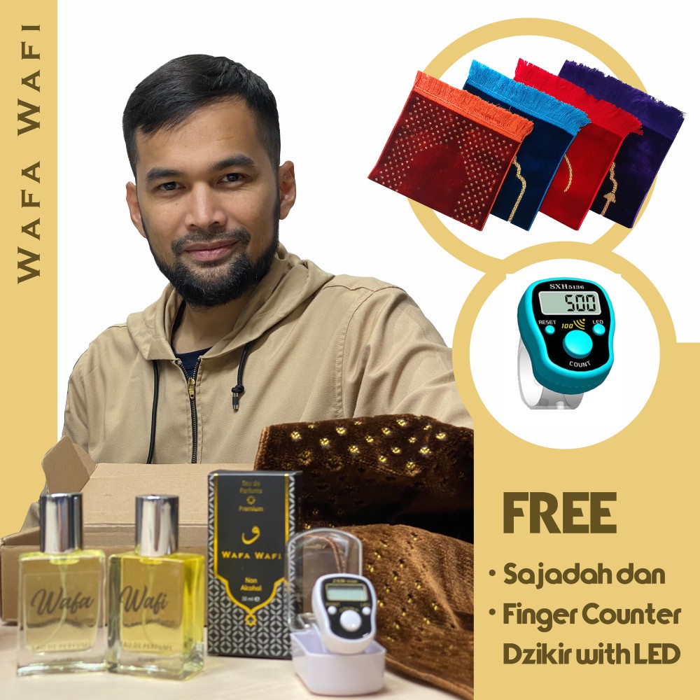 1. Parfum Wafa untuk wanita 2. Parfum Wafi untuk pria 3. Sajadah Mini yang mudah dibawa bepergian (FREE) 4. Finger Counter with LED, dzikir di ruangan gelap pun tetap terlihat (FREE)